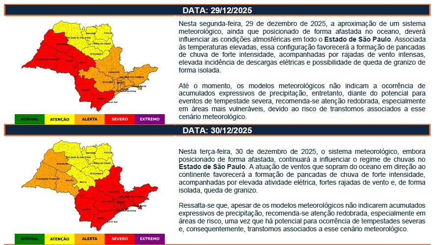 A Defesa Civil do Estado de São Paulo emitiu um alerta meteorológico para todo o território paulista devido à previsão de chuvas fortes acompanhadas de tempestades severas entre segunda-feira (29) e terça-feira (30). A condição climática é provocada pela influência de um sistema meteorológico associado às altas temperaturas, típico do período de verão. De acordo com o boletim, estão previstas pancadas de chuva de forte intensidade, com elevada incidência de raios, rajadas intensas de vento e possibilidade de queda de granizo de forma isolada. Apesar de os modelos meteorológicos não indicarem acumulados elevados de chuva, o cenário apresenta potencial para transtornos, principalmente em áreas mais vulneráveis. Entre os principais riscos estão alagamentos, enxurradas, deslizamentos de terra, além de ocorrências relacionadas a ventos fortes, descargas elétricas e granizo, que podem causar danos à infraestrutura urbana, quedas de árvores e interrupções pontuais de serviços. A Defesa Civil reforça a necessidade de atenção redobrada da população e recomenda o acompanhamento constante dos alertas oficiais emitidos pelos órgãos de monitoramento. De acordo com a previsão, a região de Presidente Prudente na segunda-feira (29) encontra-se na cor vermelha com grau de risco severo e em situação de alerta na terça-feira (30). A Defesa Civil do Estado segue monitorando as condições meteorológicas e poderá emitir novos alertas conforme a evolução do sistema climático.