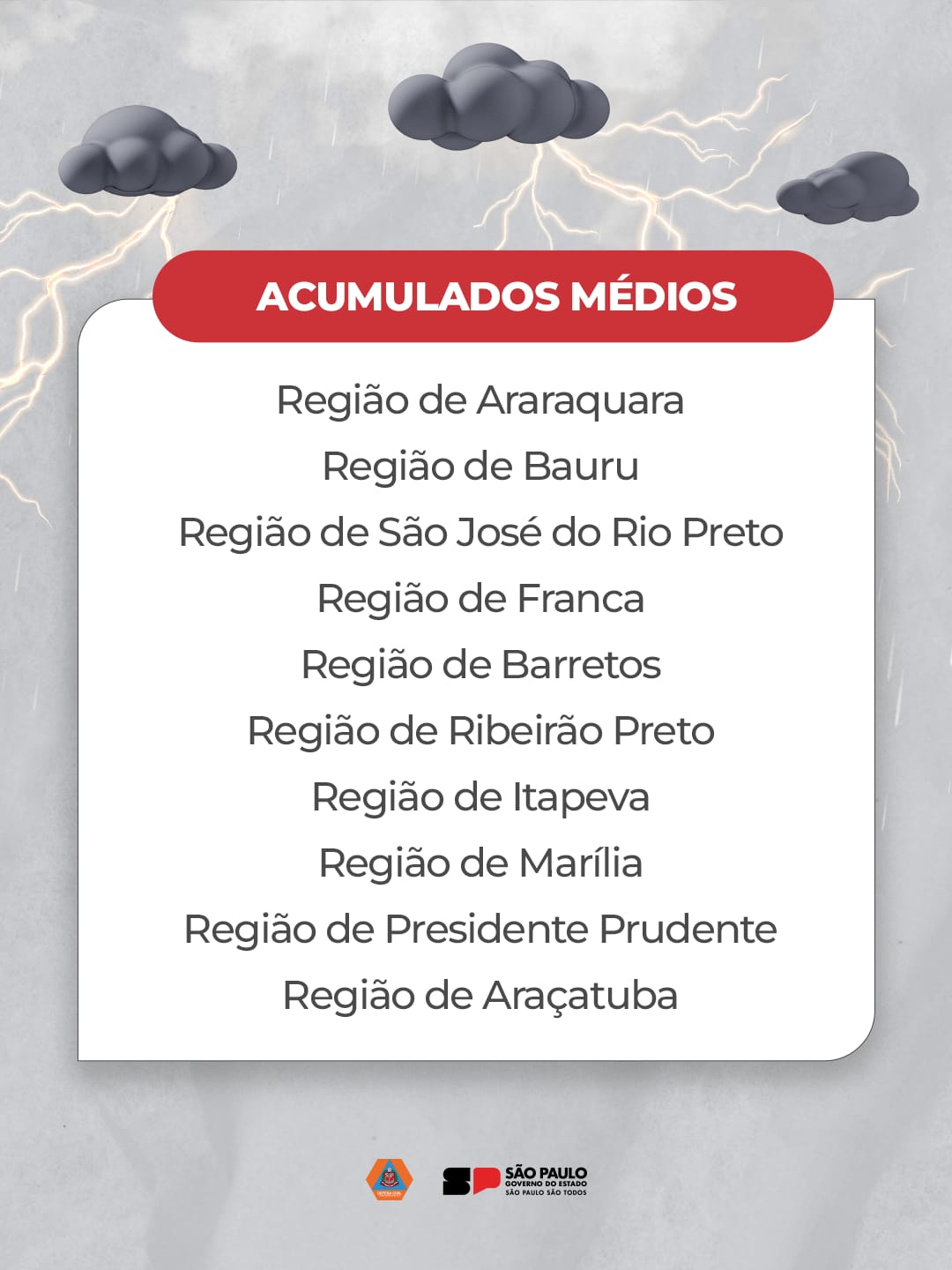 As temperaturas seguem elevadas, com sensação de abafamento, o que favorece a formação de nuvens carregadas. Durante os períodos de chuva, não se descarta a ocorrência de temporais isolados, acompanhados de raios e rajadas de vento moderadas a fortes.