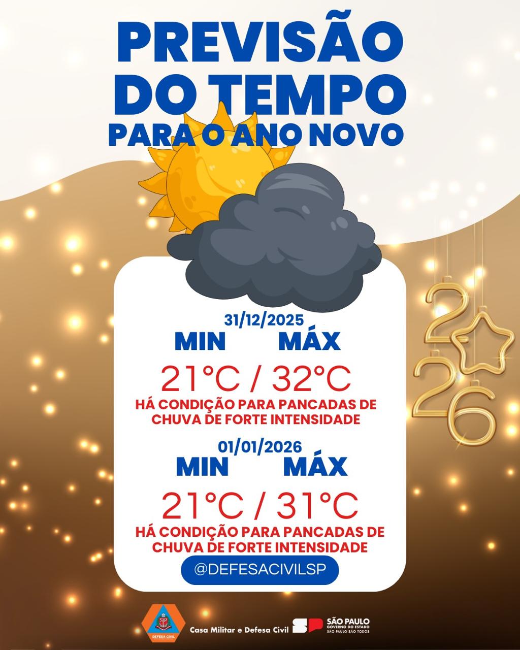 A recomendação é acompanhar as atualizações da previsão do tempo e os comunicados oficiais, especialmente para quem pretende participar de eventos ao ar livre na virada do ano.