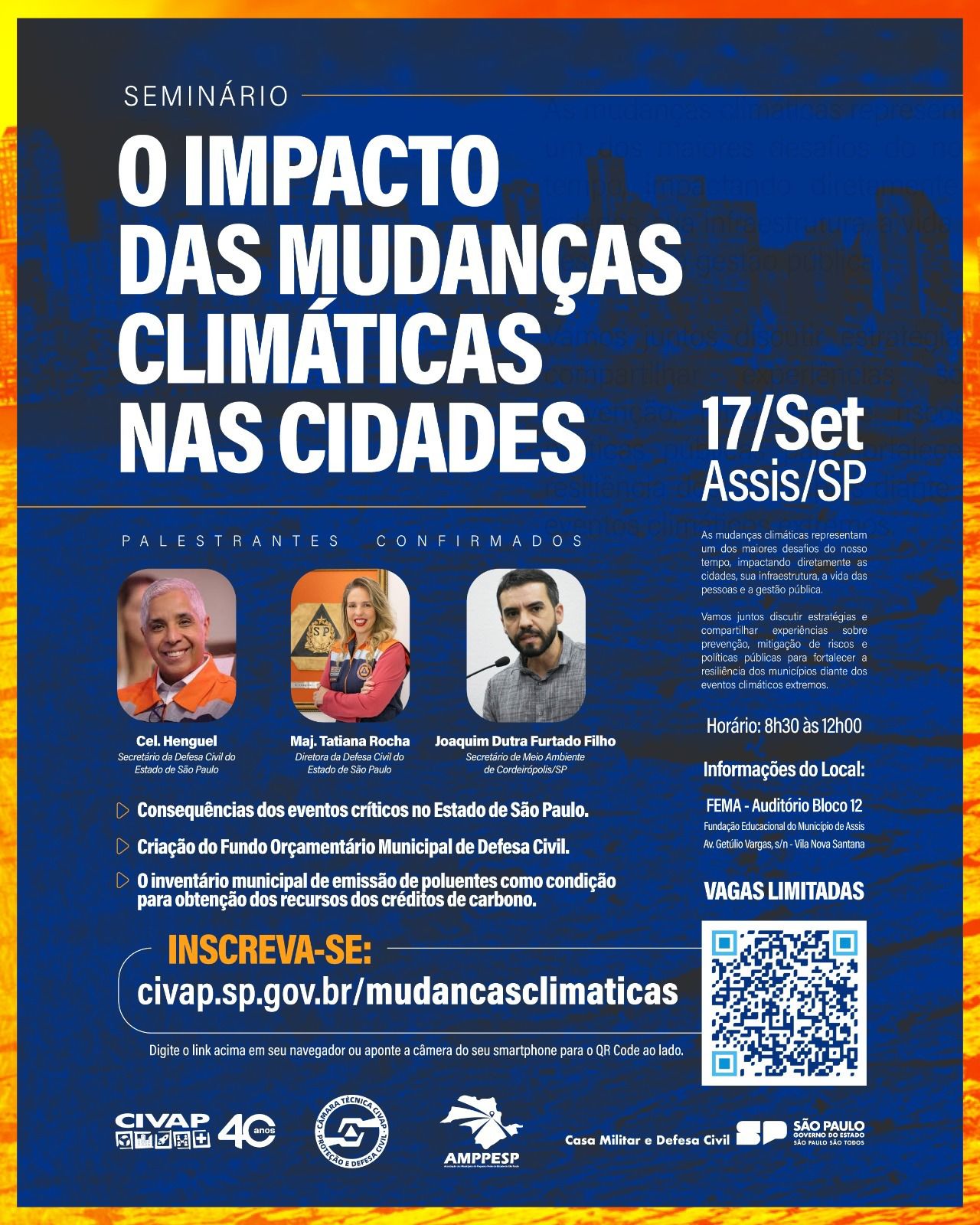 As mudanças climáticas estão entre os maiores desafios do nosso tempo, afetando diretamente a vida nas cidades, sua infraestrutura, as pessoas e a gestão pública. Pensando nisso, será realizado em 17 de setembro de 2025, em Assis/SP, o Seminário: O Impacto das Mudanças Climáticas nas Cidades.