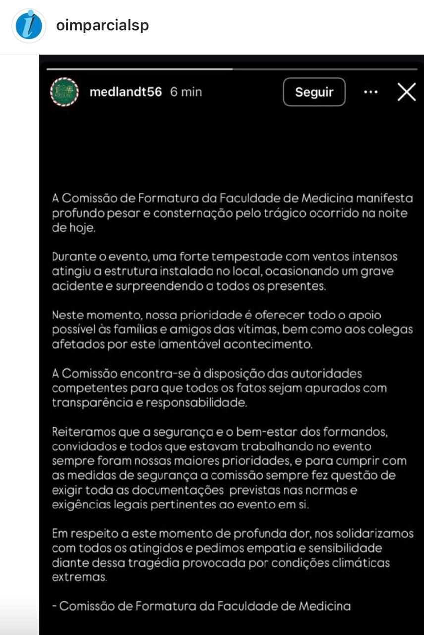 Uma forte tempestade acompanhada de ventos intensos, estimados entre 85 e 95 km/h segundo o Centro de Gerenciamento de Emergências (CGE) da Defesa Civil, provocou o desabamento de parte da estrutura montada para uma cerimônia de formatura na madrugada deste domingo (2), em Regente Feijó (SP). O evento era realizado no Aeropark Clube de Voo Desportivo SDYJ, localizado na Rodovia Raposo Tavares, km 555, e reunia formandos da Faculdade de Medicina. De acordo com informações preliminares, houve uma morte confirmada e aproximadamente 70 pessoas ficaram feridas. Equipes das Defesas Civis de Regente Feijó, Presidente Prudente e Martinópolis foram imediatamente acionadas, junto com o Corpo de Bombeiros, Polícia Militar, Polícia Civil e Polícia Técnico-Científica, que realizam o atendimento no local e a apuração das causas do acidente. A Defesa Civil já vinha emitindo alertas meteorológicos desde sexta-feira, alertando para o risco de chuvas fortes, ventos e raios na região. O último aviso foi divulgado à 1h35 da madrugada deste domingo, destacando a aproximação de uma forte célula de chuva, com rajadas de vento sobre Presidente Prudente e municípios vizinhos, incluindo Regente Feijó. O chamado de emergência para as equipes de resgate ocorreu por volta das 2h03. A estrutura do evento possuía AVCB (Auto de Vistoria do Corpo de Bombeiros) aprovado, conforme informado pelas autoridades. Em nota oficial, a Comissão de Formatura da Faculdade de Medicina manifestou profundo pesar e consternação pelo ocorrido, afirmando que a prioridade neste momento é oferecer apoio às famílias das vítimas e aos colegas afetados. A Comissão também declarou estar à disposição das autoridades competentes para garantir transparência e responsabilidade na apuração dos fatos. “Reiteramos que a segurança e o bem-estar dos formandos, convidados e todos os que estavam trabalhando no evento sempre foram nossas maiores prioridades”, diz o comunicado. A Defesa Civil reforça a importância de a população atentar-se aos alertas oficiais e buscar abrigo seguro durante temporais com ventos fortes e descargas elétricas.