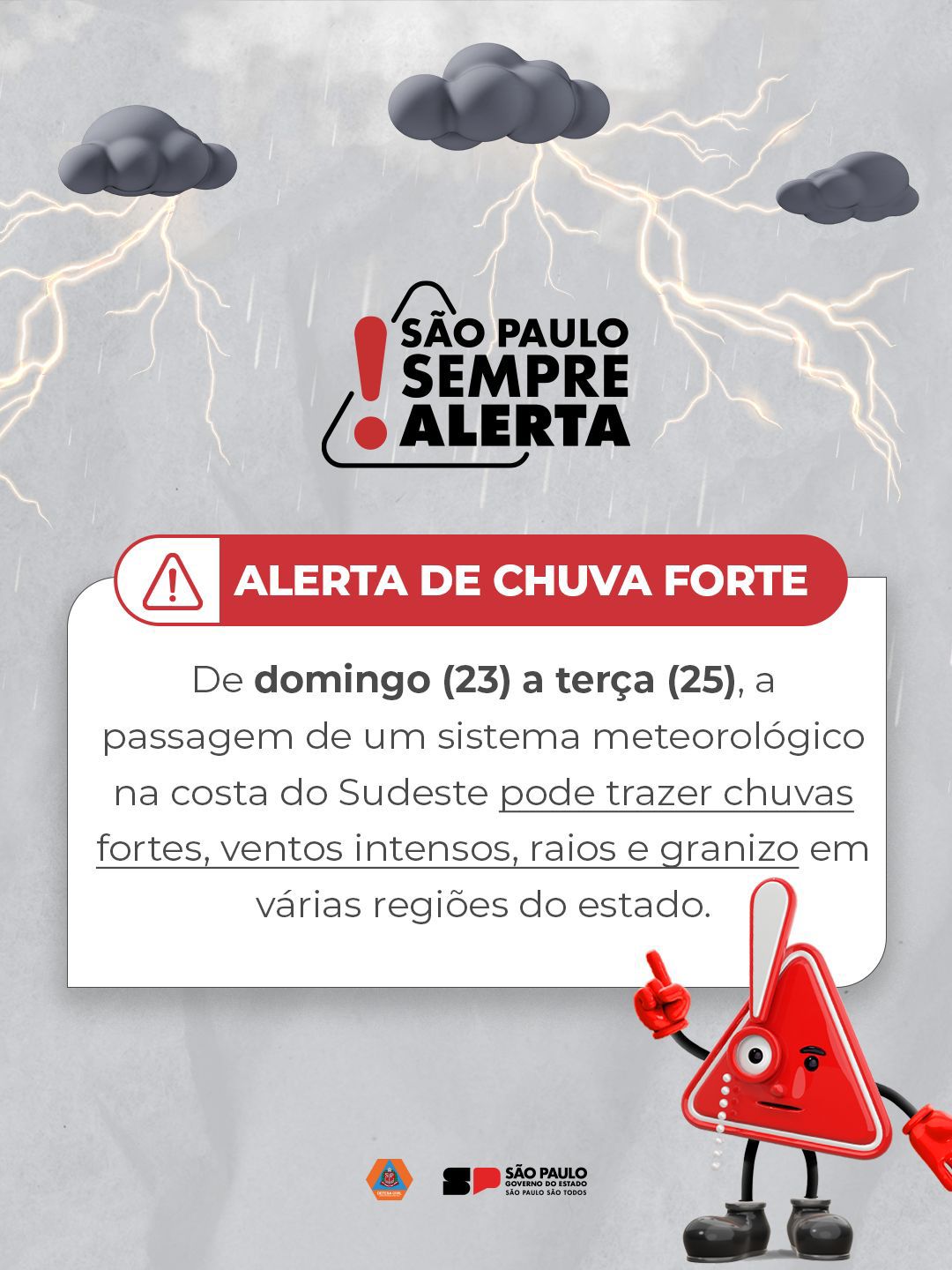 A Defesa Civil do Estado de São Paulo emitiu, neste sábado, um alerta para a ocorrência de chuvas fortes entre os dias 23 (domingo) e 25 (terça-feira). A previsão indica que a passagem lenta de um sistema meteorológico pela costa do Sudeste poderá provocar fortes pancadas de chuva, acompanhadas de raios, ventos intensos e possibilidade de granizo em diversas regiões paulistas.