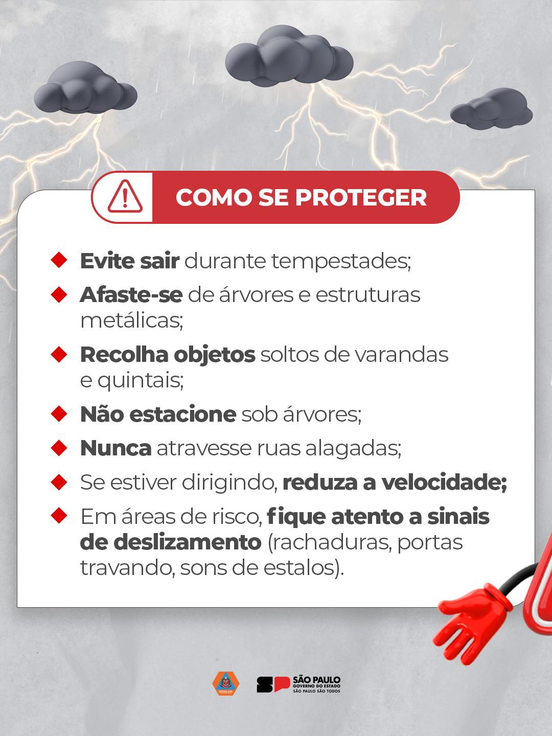 Além da previsão de tempestades, a Defesa Civil reforça orientações para reduzir riscos e proteger a população: