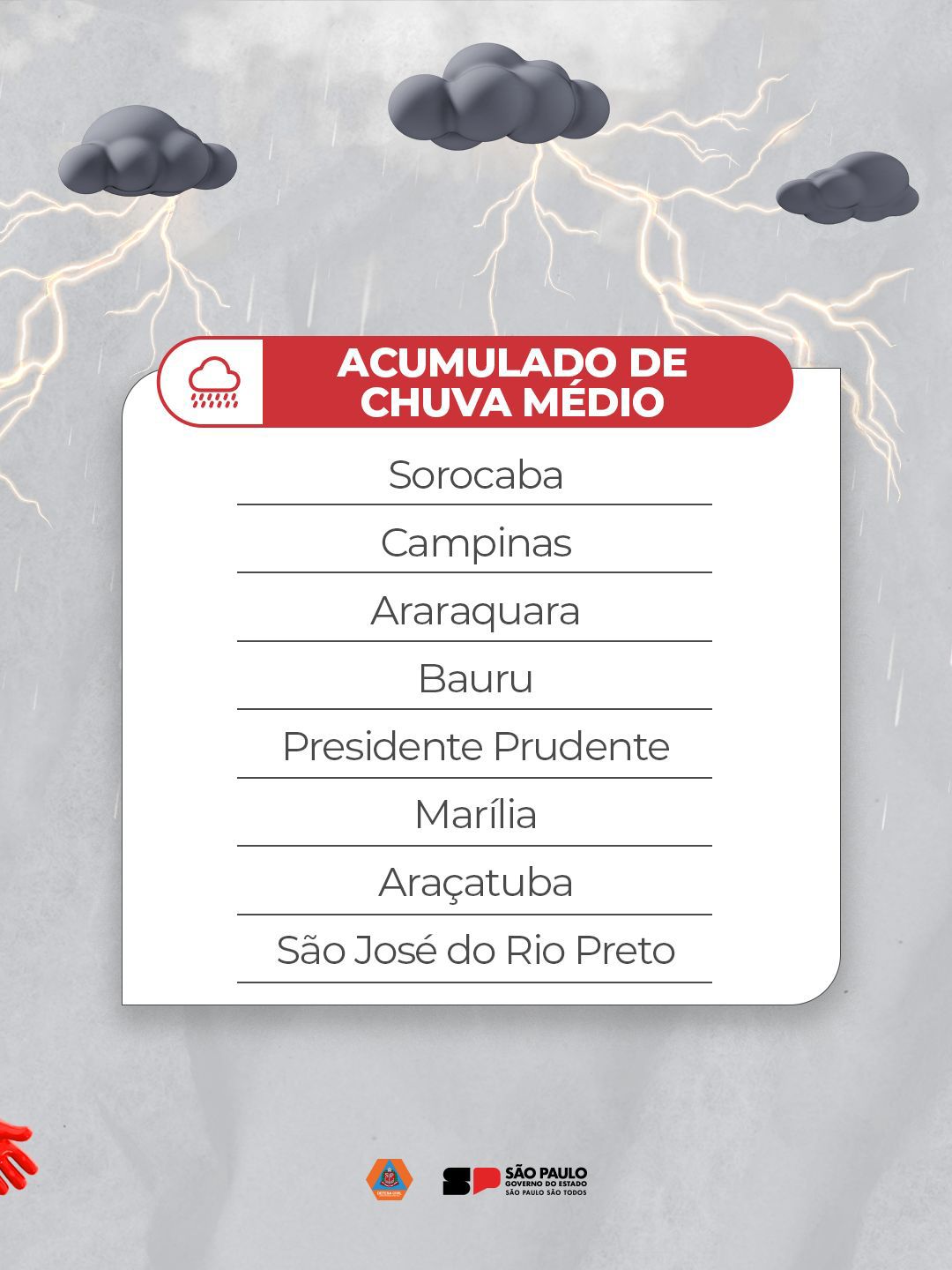 Segundo os modelos meteorológicos analisados pelo órgão, municípios como Sorocaba, Campinas, Araraquara, Bauru, Presidente Prudente, Marília, Araçatuba e São José do Rio Preto devem registrar acumulados de chuva durante o período.