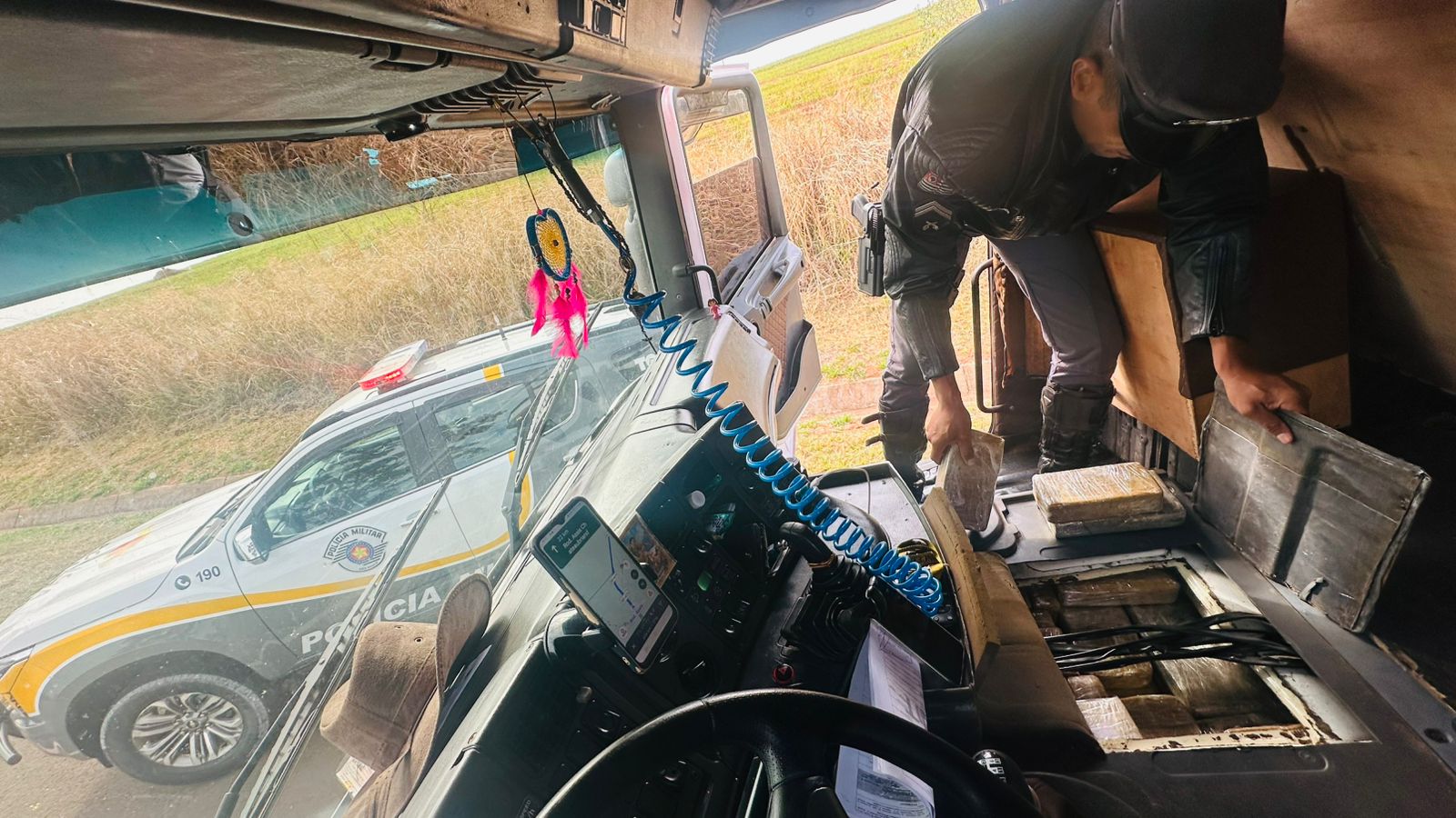 Durante a abordagem, o condutor apresentou grande nervosismo, fato que motivou a realização de uma busca veicular mais apurada. Na busca, os agentes localizaram um fundo falso dentro da cabine, onde armazenava em seu interior 94 tabletes de cocaína, que após pesados perfizeram a quantidade de 96 quilos e 600 gramas.