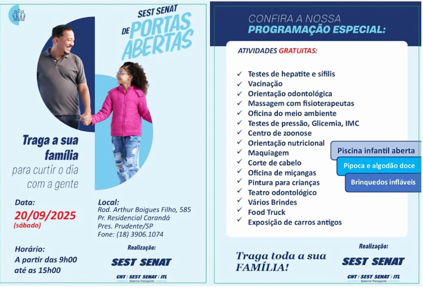 Hoje o SEST SENAT realiza o evento “Portas Abertas”, das 9h às 15h, em sua unidade localizada na Rodovia Arthur Boigues Filho, 585, no Residencial Carandá. A programação contará com diversas atividades gratuitas, voltadas para toda a família. Entre os serviços de saúde, haverá testes de hepatite e sífilis, vacinação, orientação odontológica, aferição de pressão arterial, glicemia e IMC, além de orientação nutricional e massagem com fisioterapeutas. O público também poderá aproveitar oficinas de meio ambiente e de miçangas, maquiagem, corte de cabelo, pintura para crianças, teatro odontológico, além de orientações do Centro de Zoonoses. A Secretaria Municipal de Mobilidade Urbana e Cooperação em Segurança Pública (SEMOB) vai marcar presença no evento, serão realizadas ações educativas com foco na conscientização de motoristas, ciclistas e pedestres. A principal atração é a Cidade Mirim, projeto de sucesso entre as crianças, que ensina na prática as regras de circulação e cidadania no trânsito. Para animar ainda mais o dia, estão previstas atrações como piscina infantil aberta, brinquedos infláveis, pipoca e algodão-doce gratuitos, exposição de carros antigos, food truck e distribuição de brindes. O SEST SENAT convida toda a população a participar e aproveitar um sábado diferente, com lazer, saúde e diversão para todas as idades.