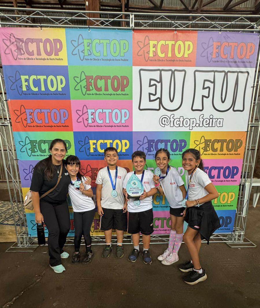 Foto: A professora Rosiane Nunes com os alunos Lara Gulim, Adrian Aguiar, Vinícius Gouvea, Helena Souza e Paolla Perenha do 4ª ano do SESI, ficaram com o primeiro lugar na categoria Mirim.