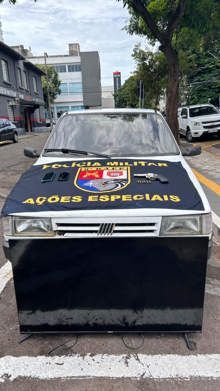 Em buscas na residência, foram localizados um revólver de calibre 38, várias munições e o aparelho de TV roubado.