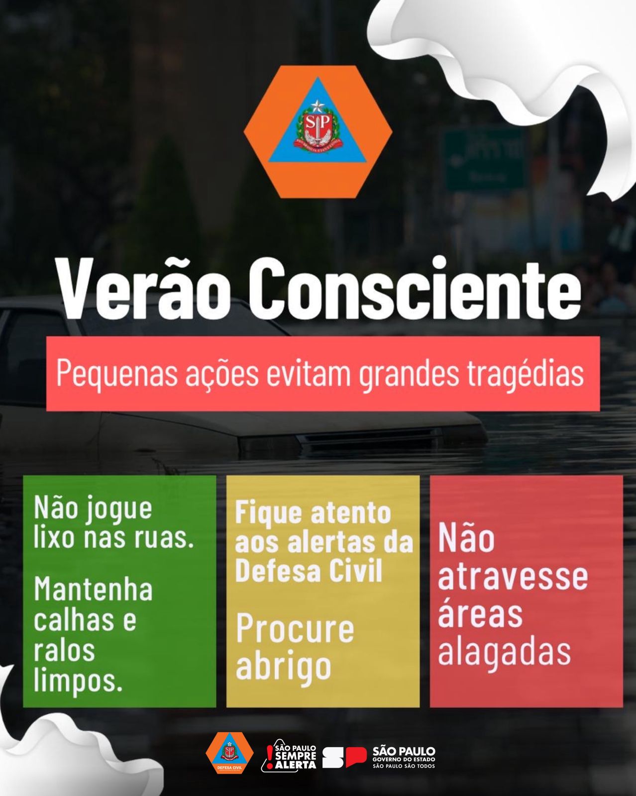 Não jogue lixo nas ruas, mantenha calhas e ralos limpos, fique atento aos alertas da Defesa Civil e jamais atravesse áreas alagadas.