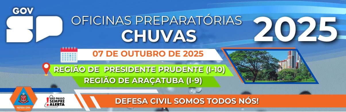 A Defesa Civil do Estado de São Paulo realiza, no dia 7 de outubro, o Treinamento São Paulo Sempre Alerta – Chuvas 2025/2026, voltado às regiões de Presidente Prudente (I-10) e Araçatuba (I-9). O encontro acontecerá de forma presencial, a partir das 8h, no Anfiteatro Municipal de Valparaíso, localizado na Rua Comendador Geremias Lunardeli, 147 – Centro. As oficinas integram o ciclo preparatório para o período das chuvas e têm como objetivo fortalecer as ações preventivas e a capacidade de resposta dos municípios.
