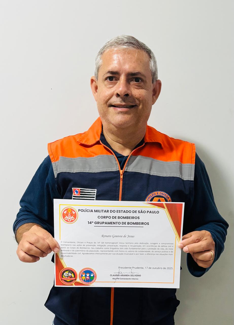 Os brigadistas e o engenheiro da Defesa Civil de Presidente Prudente foram homenageados pelo 14º Grupamento de Bombeiros em reconhecimento ao trabalho prestado durante o período de estiagem, principalmente nas ações de combate aos incêndios. A homenagem, destacou o comprometimento, a dedicação e o espírito de cooperação das equipes que atuam lado a lado com os bombeiros nas mais diversas ocorrências. Durante a cerimônia, os brigadistas receberam certificados e menções honrosas como forma de agradecimento pelos serviços prestados à população e pelo apoio essencial nas operações conjuntas de resposta a desastres. O reconhecimento reforça a importância da parceria entre o Corpo de Bombeiros e a Coordenadoria de Proteção e Defesa Civil, que, de forma integrada, desenvolvem ações de prevenção, mitigação, preparação resposta e recuperação. Segundo o engenheiro da Defesa Civil Municipal Adauto Bibiano, o momento simboliza o resultado de um trabalho coletivo e o fortalecimento das ações de proteção e defesa civil. “É uma honra receber esse reconhecimento do Corpo de Bombeiros, uma instituição que é referência em salvamento e segurança. Essa homenagem valoriza o esforço de todos, que atuam na Defesa Civil e que se dedicam incansavelmente em prol da vida e do meio ambiente”, destacou Bibiano. A cerimônia reafirmou o compromisso do Corpo de Bombeiros e da Defesa Civil de sempre atuar de forma integrada, fortalecendo a cultura de prevenção e o apoio mútuo em emergências.