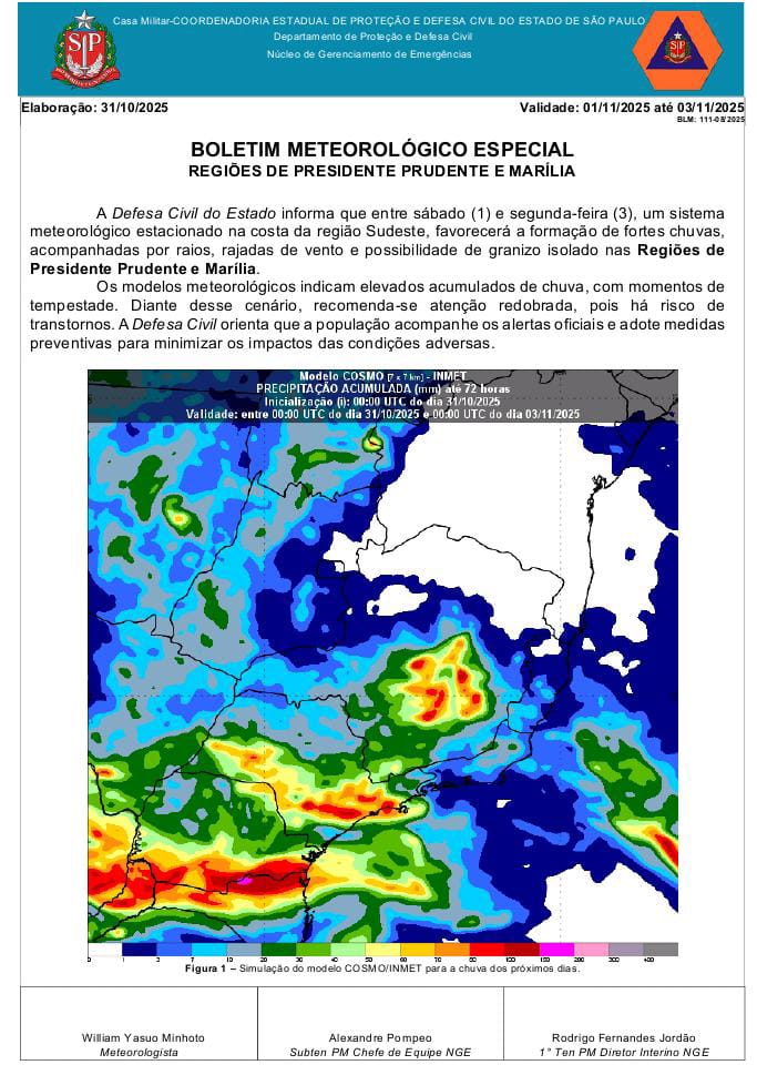 A Defesa Civil do Estado de São Paulo emitiu um boletim especial nesta sexta-feira (31) alertando para a formação de fortes chuvas entre sábado (1º) e segunda-feira (3), devido à atuação de um sistema meteorológico estacionado na costa da região Sudeste.