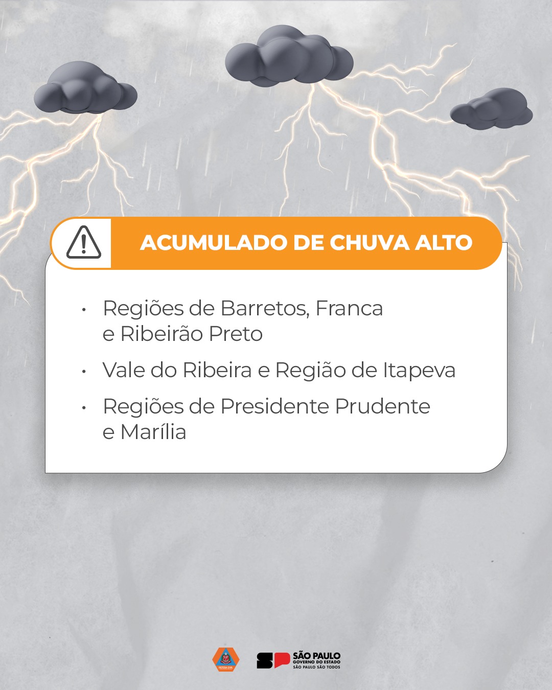 A passagem de uma frente fria e a umidade vinda da Amazônia aumentam o risco de chuvas fortes em várias regiões do Estado.