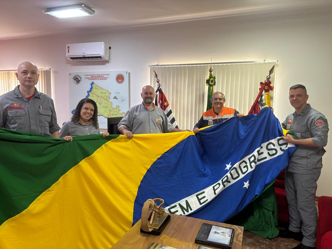 Na manhã desta terça-feira (19), o 14º Grupamento de Bombeiros de Presidente Prudente realizou uma solenidade alusiva ao Dia da Bandeira, celebrado nacionalmente em 19 de novembro. A solenidade militar contou com a presença do efetivo do Corpo de Bombeiros das áreas administrativas e operacionais. A Defesa Civil esteve representada pelo subcomandante do 14ºGB e coordenador regional, Capitão PM Erlon Pavesi, e pelo adjunto, Renato Gouvea, reforçando a parceria contínua entre as instituições. A solenidade foi conduzida pelo comandante do 14º GB, Major PM Cláudio Aranda Selverio, que destacou a importância da data e dos valores que a Bandeira Nacional simboliza para o país e para a corporação. Durante o evento, o grupamento recebeu uma nova bandeira do Brasil, uma doação da empresa MS Locação, que foi entregue pelos empresários Ricardo Spigaroli Marcelino e Josilaine Marcelino Spigaroli, o Major Aranda agradeceu a doação e ressaltou a relevância do apoio da sociedade civil às forças de segurança. “Parcerias como esta fortalecem nosso trabalho diário e demonstram o reconhecimento da comunidade ao serviço prestado pelo Corpo de Bombeiros”, afirmou. A solenidade foi marcada pelo respeito às tradições militares e pela integração entre instituições públicas e iniciativa privada, reforçando o compromisso coletivo com a cidadania e a segurança da população.