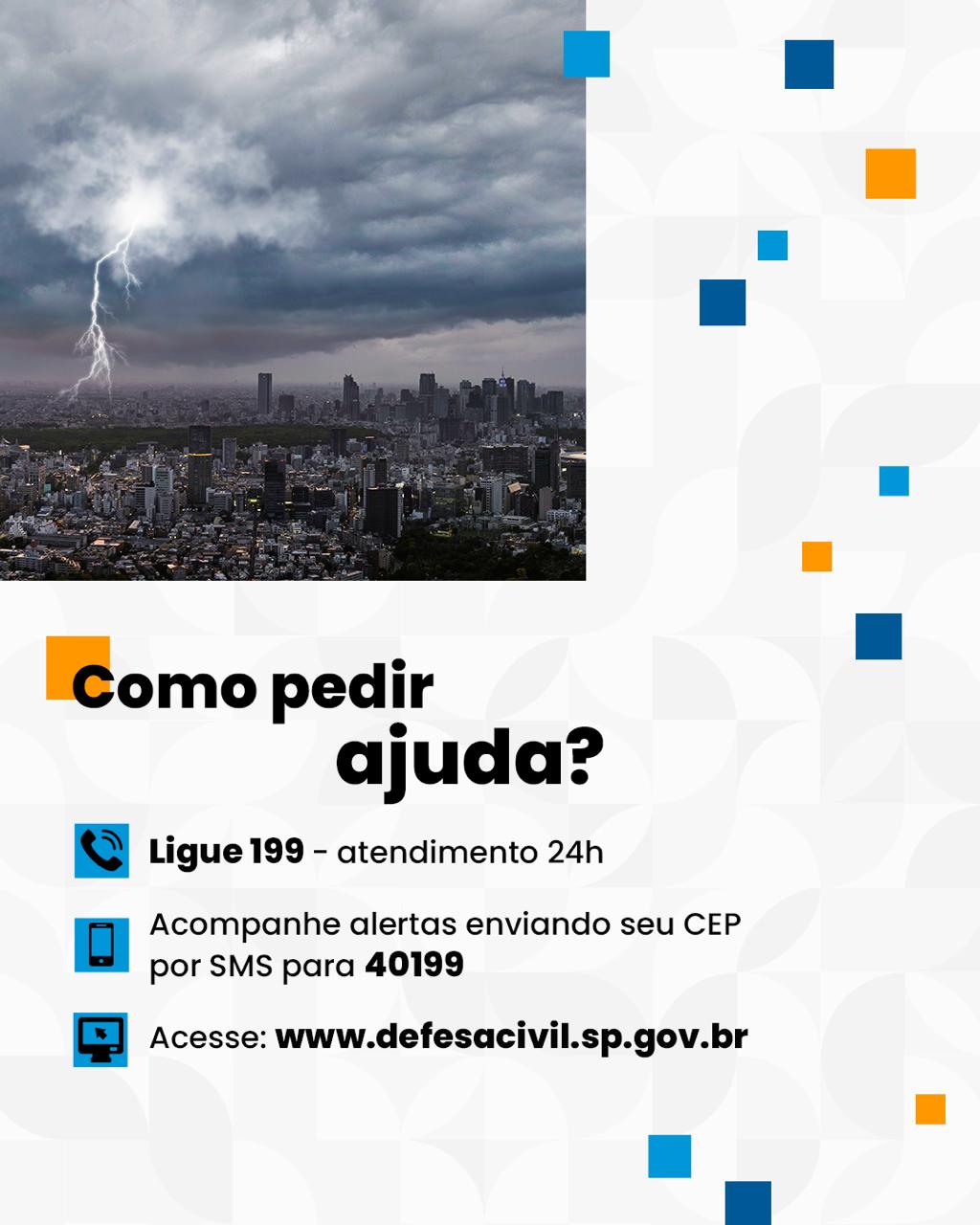 Nesses casos, o atendimento pode ser solicitado pelo telefone 199, canal oficial de emergência da Defesa Civil. A chamada é gratuita e funciona 24 horas por dia. Muito importante conhecer o número de acionamento da Coordenadoria de Proteção e Defesa Civil do seu município. Além disso, para aumentar a segurança e prevenir acidentes, os moradores podem receber alertas de emergência diretamente no celular. O serviço é simples: basta enviar o CEP de sua residência, por SMS, para o número 40199. A partir daí, o cidadão passa a receber avisos sobre riscos climáticos e orientações de segurança válidas para sua região.