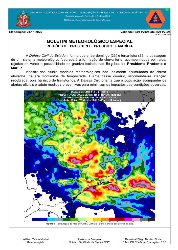 A Defesa Civil do Estado de São Paulo emitiu um alerta especial para o período entre domingo (23) e terça-feira (25), quando a lenta passagem de um sistema meteorológico deve provocar fortes chuvas em diversas regiões paulistas. A previsão indica temporais acompanhados por raios, rajadas de vento e possibilidade de granizo isolado.